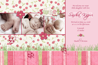 Here are the two birth announcements that we made for Sasha! Thanks to my two TRICIA'S for helping me. Tricia L. took my pictures and did a FANTASTIC job, and Tricia A. put my announcements together! We couldn't decide on just one, so we used both. One cute-sy and one more elegant!